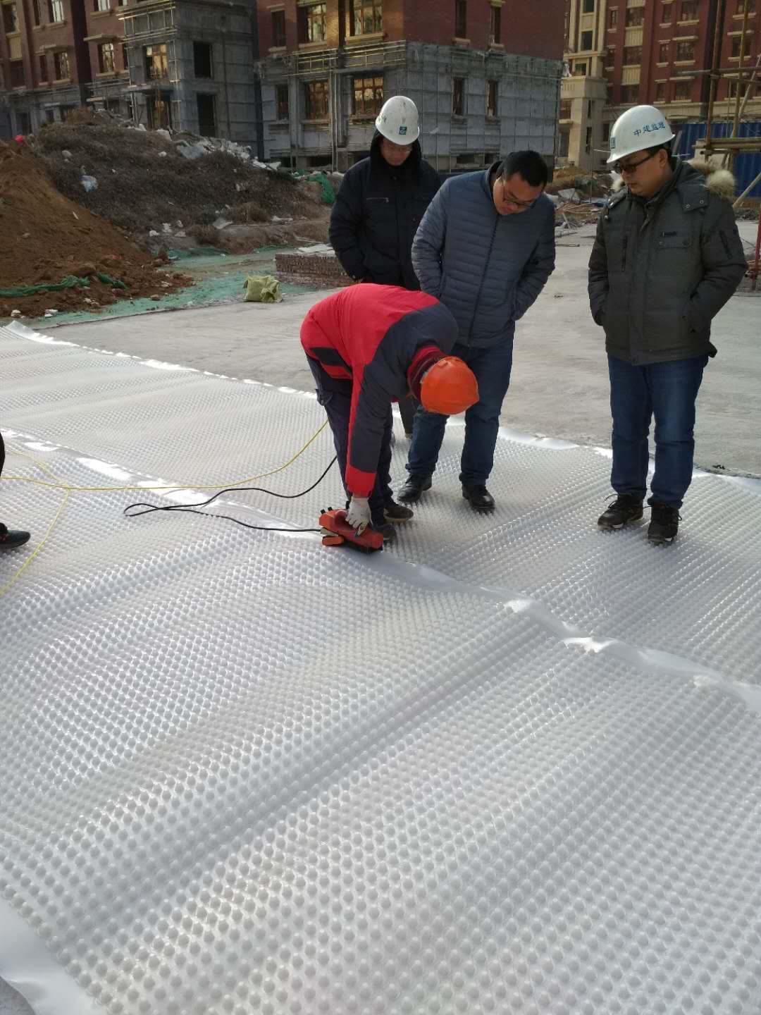 通州區(qū)客戶定制白色全新料排水板 型號是2公分 抗壓強度很高 質(zhì)量好 人上去一點沒問題 此材料是全新料生產(chǎn)的 它比普通國產(chǎn)的質(zhì)量好很多 色澤鮮亮 光滑 下面是工人們在現(xiàn)場施工圖 操作簡單 ,公司的施工技術(shù)人員劉師傅親臨現(xiàn)場指導(dǎo)
